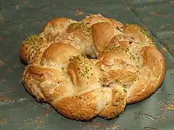• Der erste Teigstrang ist mit einer Mischung aus Marzipan, Mandeln, Pistazien und Weinbrand gefüllt. Er steht für Freude und Glück, die das neue Jahr dem Beschenkten bringen soll.