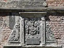 Über dem Portal wurde eine prunkvolles Wappenfeld aus Sandstein angebracht. Ornamentierte Pilaster und Gesimse rahmen das Wappen der Stadt Halle ein, das von zwei Putten gehalten wird. Unter dem Wappen befindet sich ein erhabenes Schriftfeld mit einer Inschrift. Seitlich der Pilaster sind zwei kleine Sockel mit Delphinen und Blattornamenten, unter denen zwei weitere zweizeilige Inschriften verlaufen. Die Inschrift links ist verloren gegangen, die rechte ist stark beschädigt.