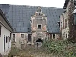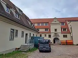 Das Hauptgebäude, das parallel zum Mühlgraben steht, ist ein langgestreckter zweistöckiger massiver Putzbau aus Ziegeln, der fünf Etagen umfasst, davon drei im steilen Satteldach. Am Haupteingang im Innenhof befindet sich ein aufwendiges Portal in Renaissanceformen mit dem für die Zeit typischen Schweifgiebel.