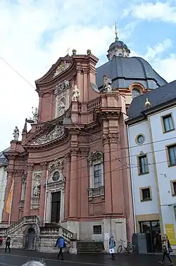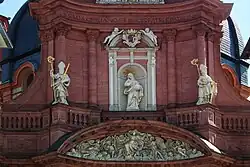 - ↑ Früher schrieb man auch den übrigen Figurenschmuck Jakob van der Auwera zu, vgl. Gertrud Krüger: Jakob van der Auwera. Ein Beitrag zur Entwicklung der Würzburger Barockplastik. Inaugural-Dissertation an der Universität Würzburg. Buchdruckerei Bavaria, Würzburg 1931, S. 29–33, doch nimmt die neuere Forschung feinere stilistische Ausdifferenzierungen vor und weist die Statuen des Obergeschosses Balthasar Esterbauer zu, vgl. Tilmann Kossatz: Die Plastik vom späten Manierismus bis zum Klassizismus. In: Peter Kolb, Ernst Günter Krening (Hrsg.): Unterfränkische Geschichte. Band 4/2. Würzburg 1999, S. 381–457, hier: S. 412. Er beschreibt erstmals die stilistischen Unterschiede der oberen Figuren, des Salvator, der Frankenapostel und des heiligen Burkard, die er Esterbauer zuschreibt, zu den klar den Stil Jakob van der Auweras repräsentierenden beiden Johannes am Portal und der Himmelskönigin im Segmentgiebel.