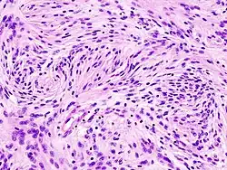 Das Ependymom ist eine Neoplasie, die sich aus Ependymzellen entwickelt, die die Hirnventrikel, den Plexus choroideus, das Filum terminale und den zentralen Kanal des Rückenmarks auskleiden. Ependymzellen sind auch im Gehirnparenchym infolge der embryonalen Migration von periventrikulären Bereichen zur Großhirnrinde vorhanden.[31][32]
