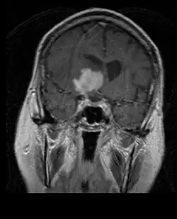 Auf -Kernspintomogrammen erscheint ein intrakranieller Tumor als massive Läsion, die nach Verwendung des Kontrastmittels lumineszierender werden kann. Eine Signalanomalie gibt es jedoch immer in -Kernspintomogrammen, die auf das Vorhandensein einer Neoplasie oder eines vasogenen Ödems hinweist. Normalerweise ist eine stärkere Lumineszenz (Kontrastverstärkung) ein Hinweis auf einen Tumor höheren Malignitätsgrades. Ein Kontrastring ist charakteristisch für ein Glioblastom, wobei der Lumineszenzanteil dem lebenswichtigen Teil des bösartigen Tumors und der dunklere -hypointense Bereich der Gewebenekrose entspricht.[4]