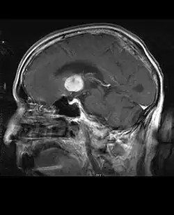 Patienten mit Meningeom können Symptome aufweisen, die für eine massive Schädelläsion typisch sind, einschließlich Anfällen und fokalen neurologischen Defiziten.[35][36] Da Meningeom auch asymptomatisch sein können, werden sie manchmal bei Computer- und Kernspintomographien aus anderen Gründen entdeckt. Dieser Resonanztumor hat ein charakteristisches Erscheinungsbild, das normalerweise aus einer gleichmäßigen Kontrastverstärkung entlang der Dura mit klarer Trennung vom Gehirnparenchym besteht. Ein weiteres Merkmal, obwohl nicht in allen Fällen vorhanden, ist der sogenannte „Duralschwanz“, der durch eine Verstärkung dargestellt wird, die über die Läsion hinausgeht und den Verankerungspunkt in der Dura anzeigt.[37]