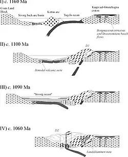 Zwischen 1200 und 1100 mya entwickelte sich neue Kruste in dem ozeanischen Inselbogen, der südlich vom Kaapvaal-Grunehogna-Kraton lag. Vor ca. 1100 mya wurde der Tugela-Ozean zwischen dem Inselbogen und dem Kaapvaal-Grunehogna-Kraton geschlossen und die Gesteine des Inselbogens dabei durchgreifend deformiert und metamorphosiert. Gleichzeitig wurden im Sivorg-Backarc weiter Laven gefördert, möglicherweise hatte sich bis 1090 mya sogar echte ozeanische Kruste gebildet (Sivorg-Ozean). Um ozeanische Kruste zu subduzieren, muss sie mindestens 30 Millionen Jahre alt sein, erst dann ist sie ausreichend abgekühlt und schwer genug, um in den Erdmantel einzutauchen. Diese Zeitspanne von 30 Millionen Jahren liegt zwischen dem Alter von Zirkon-Säumen und der Intrusion der Granite und Diorite von Laudalkammen in der nördlichen Heimefrontfjella. Eine Entstehung der Laudalkammen-Plutonite, die geochemische Charakteristika von Inselbogen-Magmatiten zeigt, wird auf eine nordgerichtete Subduktion der ozeanischen Lithosphäre des Sivorg-Ozeans zurückgeführt.[9]