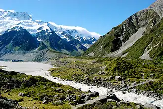 Die bekanntesten Gletscher sind der Franz-Josef-, der Fox- und der Tasman-Gletscher. In den Ebenen wird intensive Landwirtschaft betrieben, während an vielen anderen Orten extensive Weidewirtschaft vorherrscht. Nicht nur die natürliche Waldvegetation des Landes ist gefährdet, sondern ebenso alle anderen Vegetationstypen.[13][15][16]