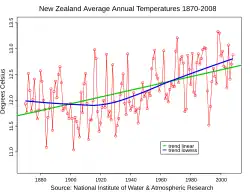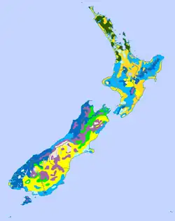 Die Nordinsel liegt in der immerfeuchten subtropischen Ökozone, wobei dies eindeutig auf die nördliche Halbinsel zutrifft, während der Rest der Nordinsel bereits im Übergangsbereich zur gemäßigten Klimazone liegt, die auf der Südinsel – als Ökozone der feuchten Mittelbreiten – voll ausgeprägt ist.[13] Dort sind alpine Wetterbedingungen entlang der Neuseeländischen Alpen anzutreffen, wobei die Westflanken der alpinen Bergketten zahlreiche regenreiche Tage aufweisen. Das Wetter im nördlichen Teil der Südinsel kann ebenfalls als gemäßigt angesehen werden, der Süden hingegen ist über das Jahr hinweg eher kühl. Eine Ausnahme stellt das Hochland von Otago im Süden der Südinsel dar. Hier herrscht ein lokal begrenztes Landklima vor, mit kalten schneereichen Wintern und warmen, trockenen Sommern. Der überwiegende Teil Neuseelands kann 600 mm bis 1600 mm Niederschlag über das Jahr hin erwarten, mit trockeneren Perioden im Sommer. Die mittleren Jahrestemperaturen liegen bei 10 °C im Süden bis 16 °C im Norden. Der Juli ist der kälteste Monat des Jahres, Januar und Februar sind dagegen die wärmsten. Die Temperaturschwankungen über das Jahr hinweg sind relativ gering. Von den Küsten zu den Bergen sinkt die Temperatur durchschnittlich um 0,7 °C pro 100 Höhenmeter.