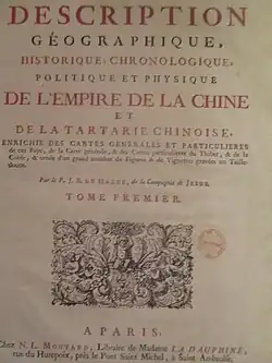 1770 veröffentlichte Moutard die zweite Auflage des Werks Description de la Chine et de la Tartarie chinoise von Jean-Baptiste Du Halde. Es handelt sich dabei womöglich um Restbestände der Auflage von 1735, versehen mit aktuellen Titelblättern. Zumindest lässt dies aus der Anzeige vom 9. November 1770 von N. L. Moutard folgern: „Der gleiche Buchhändler gibt bekannt, daß er den Rest der Auflage des folgenden Buches erworben hat, von dem nur noch 40 Exemplare übrig sind.[7]