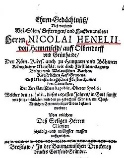 - Nicolaus Henel von Hennenfeld Silesiographia - Breslo-Graphia Frankfurt am Main 1613 mit ausführlicher Biographie