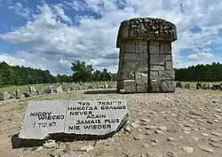 Der Ausruf „Nie wieder!“ ist in diversen Gedenkstätten wiederzufinden. Er steht in mehreren Sprachen in Stein gehauen am Mahnmal des ehemaligen Vernichtungslagers Treblinka nahe Warschau, in dem die SS schätzungsweise über 800.000 Menschen in Gaskammern ermorden ließ. Die Worte sind auch in der KZ-Gedenkstätte Dachau bei München und an weiteren NS-Gedenkorten in Europa zu lesen.[11][6]