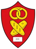 Blasonierung: „Im von Silber und Rot gevierten Schild in den silbernen Feldern je ein blaues Rebblatt und in den roten Feldern je eine goldene Brezel.“[17]