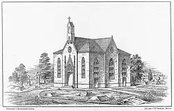 Im Jahr 1852 wurde der Friedhof nach Süden hin erweitert, indem man angrenzende Gartengrundstücke aufkaufte.[14] Das neue Areal erhielt eine Friedhofsmauer; die Weihe des neuen Bodens erfolgte am 20. November 1853. Die alte Friedhofskirche war bereits 1850[15] wegen Baufälligkeit geschlossen worden. Im Jahr 1856 wurde sie abgerissen. Der Neubau erfolgte auf dem neuen Friedhofsteil, rund 100 Meter südlich des bisherigen Kapellenstandorts. Die Grundsteinlegung fand am 26. März 1957 statt. Teile wie das spätgotische Maßwerk der Fenster, aber auch Teile der Inneneinrichtung, wurden von der alten Kapelle übernommen. Die Kirchweihe wurde am 23. November 1857 festliche begangen. Im Jahr 1864 erhielt der Friedhof abermals gen Süden eine Erweiterung mit Weihe im Jahr 1865. Im Jahr 1859 und 1868 wurde die Friedhofsmauer erneuert; der Verschönerungsverein der Stadt stiftete 1866 Bänke „mit kleinen Blumenanlagen in der Nähe“ auf dem Nieder- und Oberfriedhof.[16]