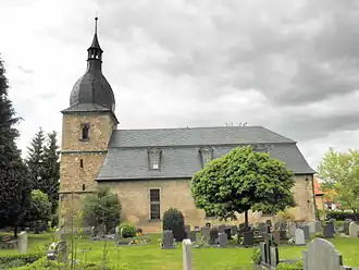 Die Kirche wurde mit Teilen des Dorfes im Sächsischen Bruderkrieg 1447 zerstört und bis 1450 wieder aufgebaut. 1726–29 entstand die Kirche in der Form, die sie weitgehend auch heute noch aufweist. An den spätgotischen Turm wurde ein Langhaus mit Mansarddach angebaut, die Emporen und das hölzerne Tonnengewölbe wurden vom Weimarer Hofmaler Johann Ernst Rentzsch mit biblischen Szenen ausgemalt.