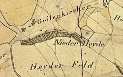 Niederheid liegt etwa eineinhalb Kilometer nördlich der Kernstadt Geilenkirchen heute an der Bundesstraße 56. Die Straße wird als Umgehungsstraße um den Ort und die Stadt herumgeführt. Den eigentlichen Kern des ehemals kleinen Weilers bildeten wenige größere Höfe, die in der Art eines Waldhufendorfes[3] an der Südseite der von der „Landstraße“ rechtwinklig abgehenden heutigen Von-Humboldt-Straße lagen, einem Weg, der Schloss Trips über Niederheid mit Gillrath verband, ergänzt durch den Dorfteich auf der Nordseite. Hinter den Höfen lag im Hofstreifen eine eingezäunte Wiese, dann schloss sich das Feld an (Heyder Feld). Einige der ehemaligen Streifenfluren lassen sich noch anhand der Wege in der Tranchotkarte erschließen. Das Gelände nördlich der Straße wird auf der Tranchot-Karte als Heide (Bruyères, Br) bezeichnet durchsetzt mit Moor-Gelände (Marais, M), daher auch die vielen ehemaligen Wasserlöcher, die beim Torfabbau blieben. Heute hat sich das Gesicht des Ortes verändert. Das Heideland begünstigte die Ansiedlung von Militär und Industrie. Der Ort ist heute von drei Industriegebieten umgeben. Der entsprechende nordöstliche Geilenkirchener Ortsteil Hochheid hat seinen Charakter weitgehender bewahren können.