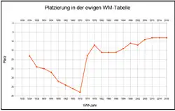 | 55 WM-Spiele 30 Siege 14[1] Unentschieden 11 Niederlagen 96:52 Tore | |