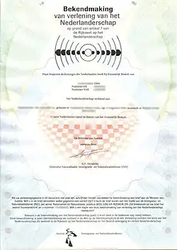 - Das Gesetz Rijkswet op het Nederlanderschap (RWN) regelt, wie die niederländische Staatsangehörigkeit erworben werden kann.[11] Vor redaktionellen Änderungen abgesehen, änderte man das Gesetz 2003 (in Kraft 2005), Anfang 2010 und 2018.[12]