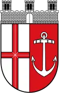 Blasonierung: „Gespalten von Silber (Weiß) und Rot; vorne ein durchgehendes facettiertes rotes Kreuz, hinten ein gesenkter silberner (weißer) Anker; im Oberwappen eine dreitürmige silberne (weiße) Mauerkrone.“ |
