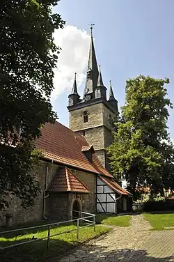 Auffallend ist die Ähnlichkeit des Kirchturms der Kirche mit dem Turm der St.-Crucis-Kirche in Großenehrich.