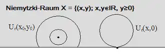 Man definiert nun eine Menge als offen in der Niemytzki-Topologie, wenn es zu jedem ein gibt mit . mit der Niemytzki-Topologie heißt Niemytzki-Raum.