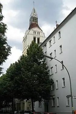 Das in die Häuserzeile eingebaute Gemeindehaus, das sich bis auf den unsymmetrisch angeordneten Turm kaum vom Vorderhaus eines Wohnhauses unterscheidet, ist mit der Kirche, die im Hof dahinter liegt, zu einer Einheit verbunden. Das Gemeindehaus enthält Versammlungsräume, die Pfarrwohnung und die Küsterei. Die dreischiffige Hallenkirche, die Seitenschiffe sind zu Gängen reduziert, hat eine rechteckige Chornische und einen Sakristeianbau.