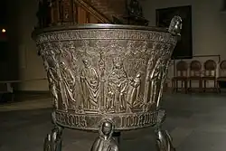 Das bronzene Taufbecken wurde Ende des 15. Jahrhunderts in Flensburg gegossen. Vergleichbare Taufbecken stehen in der Flensburger Marienkirche, der Eckernförder St.-Nicolai-Kirche und der Haderslebener Marienkirche.