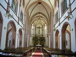 Das kreuzrippengewölbte Mittelschiff hat eine zweigeschoßige Aufrissgliederung ohne Triforium. Die Vierung mit abgefasten Spitzbögen liegt um einen Meter höher als das Mittelschiff. Das Querschiff hat dieselbe Höhe wie das Mittelschiff. Die Seitenschiffe sind zum Mittelschiff und zu den Querschiffen mit Spitzbogenarkaden geöffnet. Der eingezogene Chor ist um drei Stufen erhöht. An der Chornordseite befindet sich die Johanneskapelle mit einem Kreuzrippengewölbe. Die sechs großen Wandgemälde über den Stichbogenarkaden im Langhaus zeigen Szenen aus der Kindheit Jesu und wurden 1895 von Emanuel Walch in Stile der Nazarener gemalt.