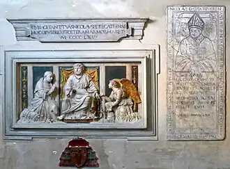Im Sommer 1464 wurde Nikolaus im Rahmen des von Pius II. betriebenen Kreuzzugsprojekts gegen die Türken beauftragt, sich um eine Schar von 5000 mittellosen und zum Teil erkrankten Kreuzfahrern zu kümmern, die bei Ancona warteten, von wo die Flotte in See stechen sollte. Bei der Besichtigung des Heerlagers muss er sich mit der Ruhr infiziert haben[15]. Nikolaus starb am 11. August in Todi, Umbrien. Sein Leichnam wurde sogleich nach Rom überführt und in seiner Titelkirche San Pietro in Vincoli beigesetzt. Das Epitaph im linken Seitenschiff der Kirche, ein Werk des Andrea Bregno, zeigt Nikolaus kniend vor dem Apostel Petrus. Sein Herz jedoch wurde auf seinen Wunsch in der Kapelle des von ihm und seinen Geschwistern 1458 gestifteten St. Nikolaus-Hospitals (Cusanusstift) in Kues bestattet. Es liegt unter einer Messingplatte im Boden vor dem Hauptaltar. In der Platte ist das Bildnis des Cusanus im Kardinalsornat eingraviert.[16] Dem Hospital vermachte er auch den Hauptteil seiner Bibliothek, der sich noch heute dort befindet. Sie gilt mit ihrer Sammlung von Hunderten mittelalterlicher Handschriften und Inkunabeln (Wiegendrucken) aus Theologie, Philosophie, Wissenschaft und Mathematik als die bedeutendste Privatbibliothek, die aus dem Mittelalter erhalten geblieben ist (siehe den Hauptartikel Bibliothek des St. Nikolaus-Hospitals (Bernkastel-Kues)).