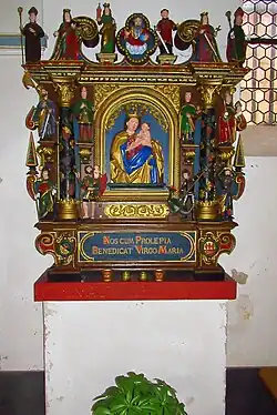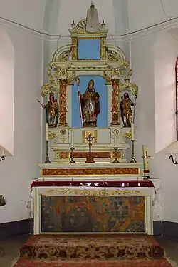 1930 erwarb Pfarrer Schuhbach bei einer Versteigerung einen Vierzehn-Nothelfer-Altar aus der ehemaligen Klosterkirche Nothgottes im Rheingau. Es ist ein frühbarocker, holzgeschnitzter Altaraufsatz von etwa 1,5 × 1,5 m Größe. In dessen Zentrum steht ein Flachrelief mit einer gekrönten Madonna mit Christuskind, eingerahmt zwischen zwei, rechts und links angeordneten Säulen und zwei, oben und unten verkröpften Gesimsen. In der Mitte auf dem oberen Sims schwebt Gottvater mit der Weltkugel in der Hand auf einer Wolke. Zu beiden Seiten befinden sich je drei Nothelferfiguren von etwa 26 cm Höhe, darunter alle drei Frauen der Gruppe. Auf beiden Seiten neben den beiden Säulen stehen jeweils zwei übereinander geordnete Nothelfer. Insgesamt sind es acht, auf Konsolen stehende freiplastische Figuren von etwa 32 cm Höhe. Eine Inschrift unterhalb des unteren Sims lautet „NOS CUM PROLE PIA BENEDICAT VIRGO MARIA“ (Maria mit dem Kinde lieb, uns allen Deinen Segen gib). Auf der Platte, auf der der Nothelferaltar steht, ist die Inschrift BETE•EIN•VATERVNSER•FVR•DEN•STIFTER (Bete ein Vaterunser für den Stifter). Zu dem Nothelferaltar kamen in den 1930er Jahren auch Menschen aus den umliegenden Orten gewallfahrtet, beispielsweise aus Salmtal, Esch oder Klausen.[10][2]