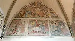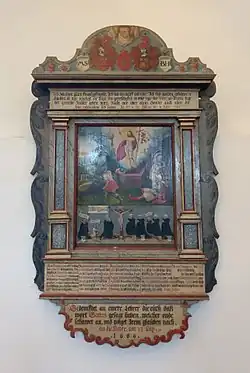 Die bei der Renovierung des Chores im Jahr 1934 gefundenen Wandmalereien sind vermutlich um 1780 entstanden. Sie zeigen an der Nordwand eine Mannalese, Passahfest, Melchisedek und Abraham sowie Elija und den Engel. Darüber erscheint in den Wolken Gottvater, die Hand zum Segen erhoben. An der Ostwand steht in der Mitte des Bildes der Baum des Lebens aus dem Garten Eden. In seiner Krone sitzt Jesus als Kind, eine Schlange windet sich um den Stamm. Das Jesuskind pflückt Äpfel, die der Heilige Geist an seine Mutter Maria übergibt, die diese an die Gläubigen weiterreicht. Auf der anderen Seite gegenüber ist Eva dargestellt, die Äpfel, die von der Schlange gepflückt werden, an die Sünder weitergibt.[6]