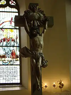 An der Westfassade befindet sich seit 1949 ein großes Sgraffito von Rudolf Yelin d. J. mit dem nach der NS- und Kriegszeit häufig umgesetzten Motiv des Erzengels Michael, der gegen das Böse kämpft.