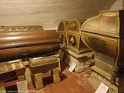 Außer den heute erhaltenen 18 Sarkophagen befanden sich einst noch weitere in der Gruft. Zwei Sarkophage wurden 1706 bei einem von dem Türmer und Musikanten Franz Dübner verübten Grabraub noch in der Gruft mit einem aus Bodenfliesen gebauten Schmelzofen eingeschmolzen, wofür der ertappte Räuber hingerichtet wurde.