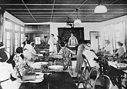 Amerikanische und kanadische Lehrerinnen besuchen auf Einladung der Nippon Bunka Renmei einen Kurs zum Blumenstecken in Tokyo (13. Aug. 1938).