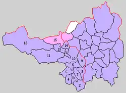 15.: das damalige Dorf Hiraizumi (平泉村); 1953 wurde es zur Stadt und fusionierte 1955 mit dem Dorf Nagashima aus Ost-Iwai,[1] heutige Ausdehnung in pink.