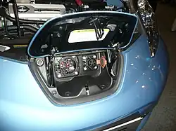 - CHAdeMO-Gleichstrom-Anschluss für Schnellladung mit typisch 50 kW[18], mit dem ein Ladezustand von 80 % in 20–30 Minuten erreicht wird.
