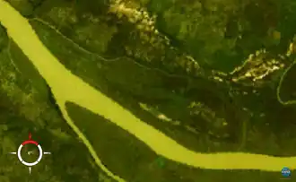 Der Gambia fließt hier im Bildausschnitt in westlicher Richtung. Der nördliche Kanal bei Njubou Island ist im Mangrovenwald kaum erkennbar.