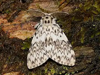 Die Falter erreichen eine Flügelspannweite von 30 bis 50 Millimetern. Die Weibchen sind deutlich größer als die männlichen Tiere. Die Grundfarbe ist weiß mit vielen verschieden dicken und zackigen dunklen Bändern und Punkten. Hin und wieder tauchen auch ganz schwarze Individuen auf. Bei einer Massenvermehrung sind sogar 50 Prozent der neuen Generation fast schwarz. Die dunklen Formen besitzen eine gewisse Ähnlichkeit mit den Männchen des Schwammspinners. Die Hinterflügel sind von beiger Farbe und weisen schwarze Saumpunkte auf.