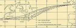 Die Heimreise ging im ganzen Jahr von Sandy Hook bis 70° w. L. und 40°10´. In der 1. Jahreshälfte war dann nach 47° w. L. und 41° n. Br. und auf dem Großkreis nach Fastnet zu fahren, in der 2. Jahreshälfte nach 60° w. L. und 42°5´ und auf dem Großkreis nach Fastnet oder Scilly.[1]