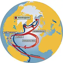 In den subpolaren Regionen – insbesondere in der Labradorsee, Grönlandsee und östlich von Neufundland – kühlt das Wasser stark ab. Gleichzeitig wird es durch Verdunstung und Meereisbildung salzhaltiger. Die Dichte steigt, und das Wasser sinkt in die Tiefe: Es entsteht Nordatlantisches Tiefenwasser (North Atlantic Deep Water, NADW). Dieser Prozess ist zentral für die thermohaline Zirkulation.[4]
