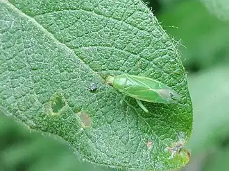 Die pflanzenfressende Art besiedelt Laubgehölze und war ursprünglich nur an Weiden (Salix) (Sal-Weide (Salix caprea), Asch-Weide (Salix cinerea), Purpur-Weide (Salix purpurea) und Korb-Weide (Salix viminalis)) und einigen anderen Gattungen, wie etwa Erlen (Alnus) zu finden, kommt aber seit etwa 150 Jahren auch regional an verschiedenen Kulturpflanzen, wie z. B. Kulturapfel (Malus domestica), Johannisbeeren (Ribes) vor. Insbesondere im atlantisch beeinflussten West- und Nordeuropa ist sie an Äpfeln von wirtschaftlicher Bedeutung, verlor aber in den letzten etwa 50 Jahren dabei an Bedeutung. Durch das Saugen der Nymphen im April und Mai werden junge Triebe geschädigt, die in weiterer Folge absterben. Außerdem werden die Früchte durch das Saugen in ihrem Aussehen beeinträchtigt. Die adulten Tiere verursachen durch ihr Saugen an den Blättern braune Flecken. Die Weibchen stechen ihre Eier in die verholzten Teilen der Nahrungspflanzen, wie an den Trieben und dem älteren Holz ein.[2]