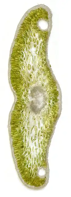 Querschnitt durch eine Nadel unter dem Mikroskop. Zwei Harzkanäle sind gut sichtbar.