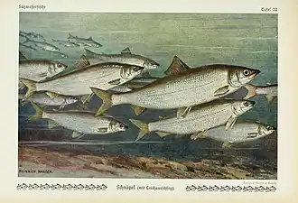 „Der Schnäpel, Coregonus oxyrhynchos“. Tafel 22 aus Emil Walter: Unsere Süßwasserfische. Leipzig: Quelle & Meyer, 1913. | ||||||||||||