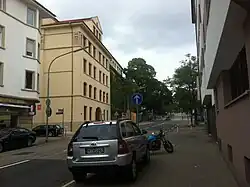 In den Jahren 1914 bis 1920 wurde die Schule im Stil der Neorenaissance erbaut.[5] Das denkmalgeschützte Gebäude liegt an der Brettener-, Sachsen- und Karolingerstraße. Es besteht aus einem dreiflügeligen Bau, der um einen Innenhof gruppiert ist. Das Kulturdenkmal besitzt kunststeingegliederte Putzfassaden und Walmdächer.[6]