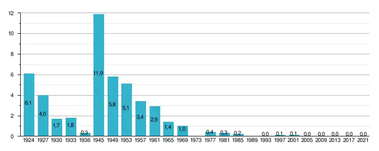 Zulauf erhielt sie zudem auch aus Gewerkschaftskreisen. Dennoch erreichte die Partei bei der Parlamentswahl des Jahres 1924 nur 6,1 Prozent der Stimmen, während die Arbeiterpartei auf 18 % kam und die Sozialdemokraten auf rund 9 %. In den Folgejahren verlor die NKP weiter an parlamentarischen Rückhalt in der Bevölkerung. Zwischen 1930 und 1945 hatte sie deshalb kein Storting-Mandat mehr inne.[4]