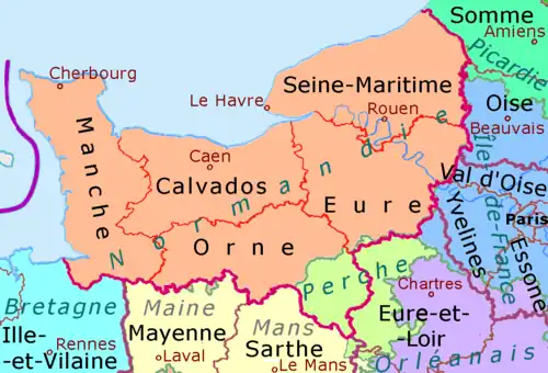 Zum Herzogtum Normandie gehörten auch die Kanalinseln; heute Kronbesitzungen des britischen Königshauses. Zwischen Pointe de Barfleur und Cap de la Hève erstreckt sich die Baie de Seine, die markanteste Bucht der Normandie. Das Herzogtum begann als Lehen an den Wikingeranführer Rollo („Gånge Rolf“) durch den westfränkischen König Karl (911). Rollos Nachfahren gelang die Eroberung Englands. Die Herzöge der Normandie waren bis 1087, von 1106 bis 1144 und ab 1154 dann auch Könige von England, das Herzogtum Normandie kam während des Hundertjährigen Kriegs unter die Herrschaft der französischen Könige. Mit der Einrichtung der Départements im Gefolge der Französischen Revolution und der Schaffung der zwei Regionen Haute-Normandie und Basse-Normandie 1972 war die Normandie keine politische Einheit mehr, die Frage der Wiedervereinigung der Normandie blieb jedoch auf der politischen Tagesordnung und wurde am 1. Januar 2016 im Zuge der Neuordnung der französischen Regionen vollzogen.