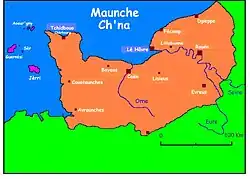 Zu ihrem heutigen Namen kam die Normandie im Mittelalter als Heimstatt der Normannen, die sich als Volksstamm aus einheimischen „französischen“ Bewohnern und hinzugekommenen Wikingern gebildet hatten. Nach Ausweis der Sprach- und Ortsnamenforschung stammte die Mehrzahl der ansässig gewordenen Wikinger aus Dänemark, ein kleinerer Teil aus Norwegen. Es ist anzunehmen, dass deren Frauen fast sämtlich aus der ansässigen heimischen Bevölkerung stammten.[5]