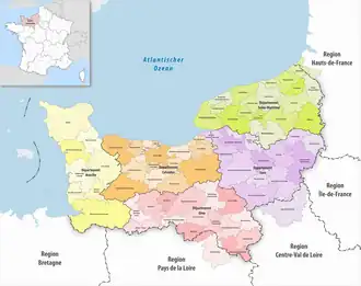 Zur Region Normandie gehören die französischen Départements Calvados (Nr. 14), Eure (27), Manche (50), Orne (61) und Seine-Maritime (76).