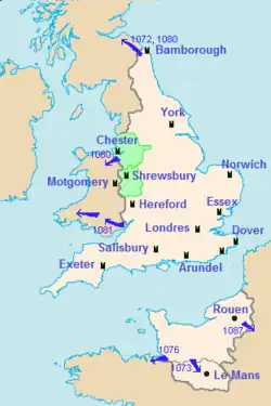 Als dritten Ausgangspunkt für Angriffe auf Wales wählte Wilhelm der Eroberer Chester, wo er um 1069 Chester Castle errichtete und 1071 Hugh d’Avranches zum Earl of Chester ernannte. Dieser eroberte mit seinen normannischen Gefolgsleuten, vor allem mit seinem Cousin Robert of Rhuddlan das walisische Cantref Tegeingl und weitere Gebiete entlang der Küste von Nordwales. 1081 konnte Robert of Rhuddlan den König von Gwynedd, Gruffydd ap Cynan, gefangen nehmen. Gruffydd ap Cynan kam erst um 1094 wieder frei, in dieser Zeit konnten die Normannen weite Teile von Gwynedd besetzen und Burgen in Caerleon, Bangor und Aberlleiniog errichten. Hugh d’Avranches starb 1101, sein Erbe wurde sein siebenjähriger Sohn Richard, der erst 1114 mündig wurde.