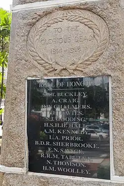 Die ursprüngliche Dekoration umfasste ein in den Stein gehauenes Relief in Form eines Lorbeerkranzes mit der Inschrift To The Glorious Death 1914–1918[Anm. 1] und eine Marmorplatte im zweiten Pyramidenstein. Die Marmorplatte listet die Namen von 13 Gefallenen des Ersten Weltkriegs auf: