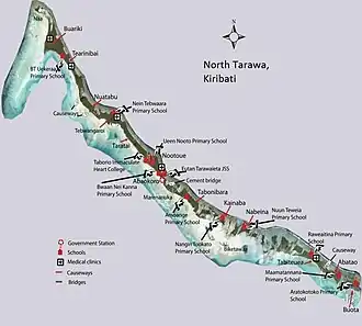 North Tarawa, auch Tarawa Ieta (Nord-Tarawa; früher Cook Island), in der Republik Kiribati, ist die nordöstliche gerade Inselkette, die zusammen mit South Tarawa das Atoll Tarawa bildet. North Tarawa ist ein eigenständiger Verwaltungsdistrikt, der durch das Eutan Tarawa Council (ETC) mit Sitz in Abaokoro gelenkt wird. Die Bevölkerung beträgt 7018 Einwohner (Stand 2020)[1], die sich auf 14 Siedlungen verteilen; die Bevölkerungsdichte beträgt 460 Einwohner je km².