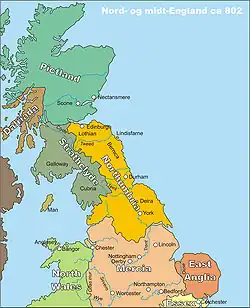 Im Jahr 793 begann die Wikingerzeit mit einem Überfall auf das Kloster Lindisfarne. Es folgten zahlreiche weitere Plünderungszüge in den Sommern, und ab 850 überwinterten die Wikinger in England. 867 wurde das südliche Teilreich Deira nach der Eroberung Yorks durch das Große Heidnische Heer der dänischen Wikinger und der Gründung des Königreich Jórvík dem Danelag einverleibt. Für das nördliche Teilreich Bernicia setzten die Wikinger den dort einheimischen König Ecgberht I. als Unterkönig ein. Nach seinem Sturz 872 versuchte sein angelsächsischer Nachfolger Ricsige, Northumbria wieder aufzurichten, wurde aber bereits 874/875 wieder nach Bernicia zurückgedrängt. Um 878 eroberten die dänischen Wikinger auch das ehemalige Bernicia, welches damit vollkommen im Königreich Jorvik aufging. Im Norden unterwarf sich Ealdred (913–927) 927 dem englischen König Æthelstan (924–939). Der englische König Eadred (946–955) konnte 954 den letzten dänischen König Erik Blutaxt vertreiben und schloss damit die Rückeroberung Northumbrias ab. Ab diesem Zeitpunkt waren die lokalen Herrscher zunächst Ealdormen und danach Earls.[2]