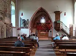 Im nach Osten ausgerichteten Chor steht ein historischer Flügelaltar, dessen Predella ein Gemälde der vermuteten Stifterfamilie zeigt (Hans Michael Horneck von Hornberg († 1498) mit Gemahlin Martha geborene von Balzhofen († 1510), sechs Söhnen und drei Töchtern), deren Wappen sich auch in den Altartafeln wiederfinden. Das Mittelbild zeigt die Beweinung Christi, die Seitenflügel zeigen die Heiligen Katharina, Petrus, Paulus und Sebastian. Der Altar weist stilistisch eine Nähe zu verschiedenen süddeutschen Meistern des frühen 16. Jahrhunderts auf und wurde bereits als Frühwerk Matthias Grünewalds betrachtet.[1]
